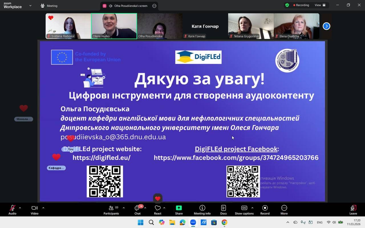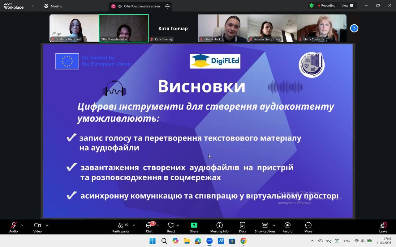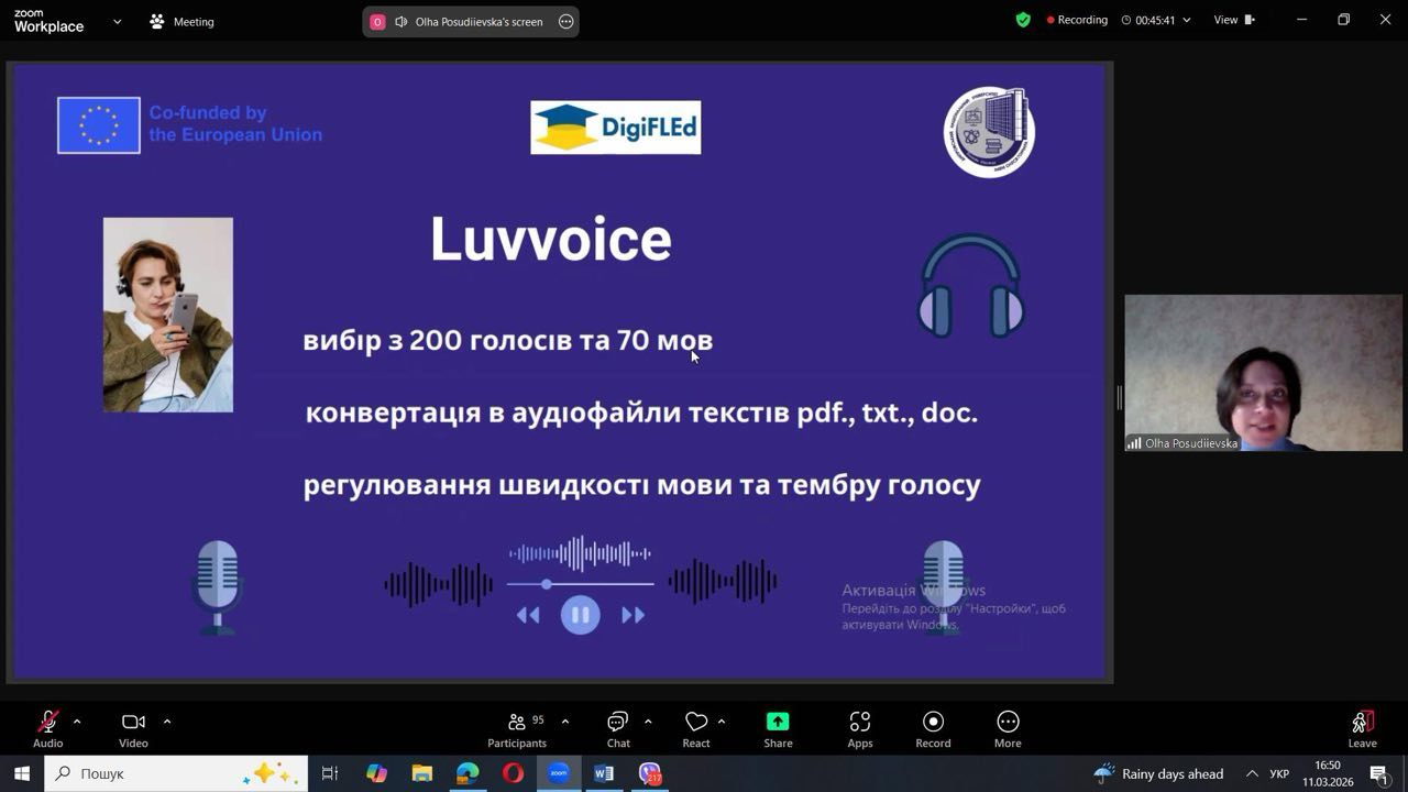 The webinar was delivered by Associate Professor Olha Posudiievska from the Department of English Language for Non-Philological Specialties, who demonstrated how modern digital tools can significantly simplify the creation and use of audio materials in education. Participants learned how, in just a few clicks, it is possible to record voice messages, convert written texts into audio files, and organise collaborative work with audio content in a shared virtual environment.