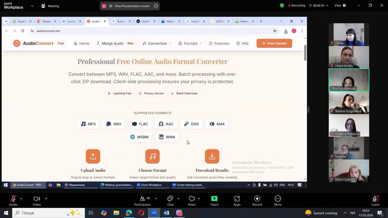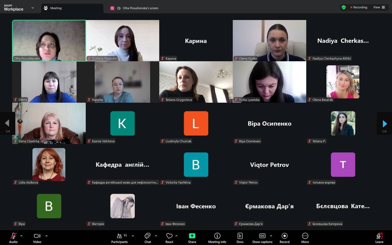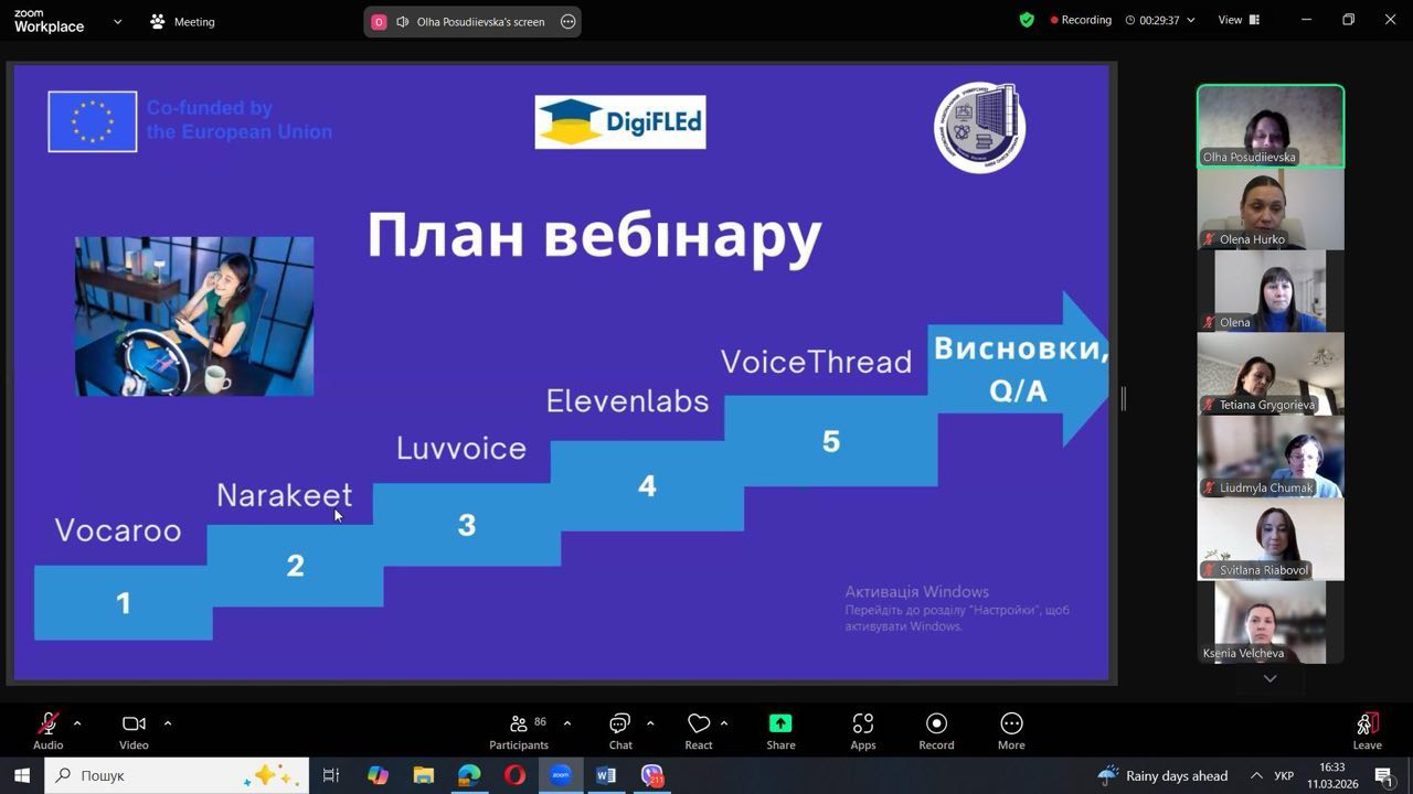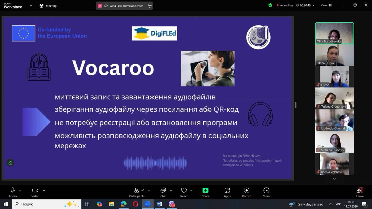 The webinar was delivered by Associate Professor Olha Posudiievska from the Department of English Language for Non-Philological Specialties, who demonstrated how modern digital tools can significantly simplify the creation and use of audio materials in education. Participants learned how, in just a few clicks, it is possible to record voice messages, convert written texts into audio files, and organise collaborative work with audio content in a shared virtual environment.