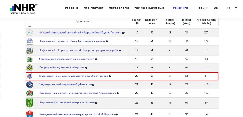 Oles Honchar Dnipro National University entered the overall TOP-20 and became the 2nd among Dnipro regional universities – these are the results of the ranking according to the National H-index 2025 indicator – an independent ranking of scientific productivity and publication activity of higher education institutions of Ukraine.