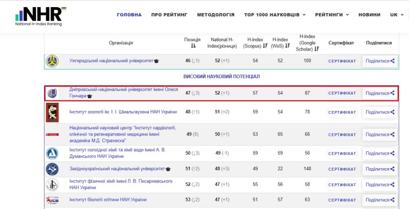 DNU – in the TOP-20 in the Ukrainian National H-index Ranking 2025