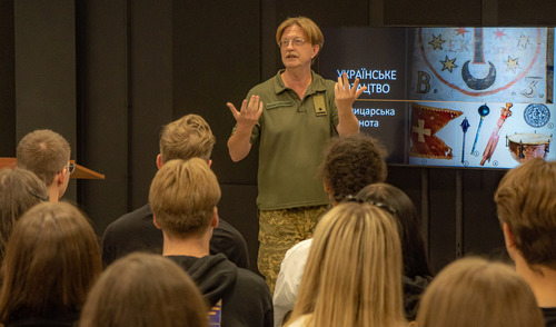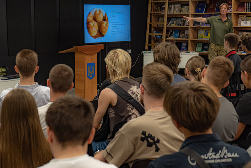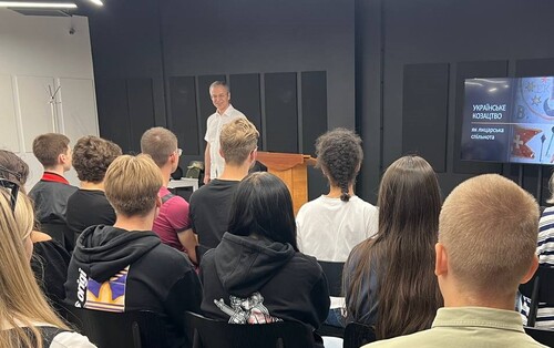 Із короткою лекцію виступив багаторічний працівник нашого університету доцент історичного факультету, а нині – майор ЗСУ Олег Репан, який у цікавий спосіб спільно з присутніми сформував образ українських козаків, продемонстрував різноманітність і спільні риси цих степових лицарів.