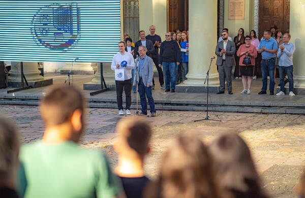 – Наше підприємство добре відоме в Україні та світі своїми розробками ракето-космічної техніки і має чимало наукових патентів – особливо актуальних в останні три роки… І всі ці технічні досягнення були зроблені здебільшого випускниками Дніпровського національного університету. Вони так само, як і ви зараз, як і я свого часу, стояли тут на урочистій Посвяті в студенти ДНУ. І знаєте, наш колектив продовжує слідкувати за талановитими студентами Alma mater, усвідомлюючи, що ви є майбутнім і нашого підприємства також. Було би здорово, аби через якихось 5-6 років я міг би потиснути руку комусь із вас уже як своєму колезі, – зазначив представник КБ «Південне», найдавнішого партнера ДНУ.
