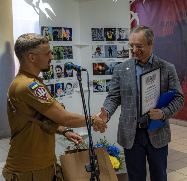 Потім пан Валерій передав ректору офіційну Подяку від імені всієї Січеславської бригади. Ця відзнака стала свідченням стійкої позиції, підтримки та тісного співробітництва нашого університету із Захисниками.