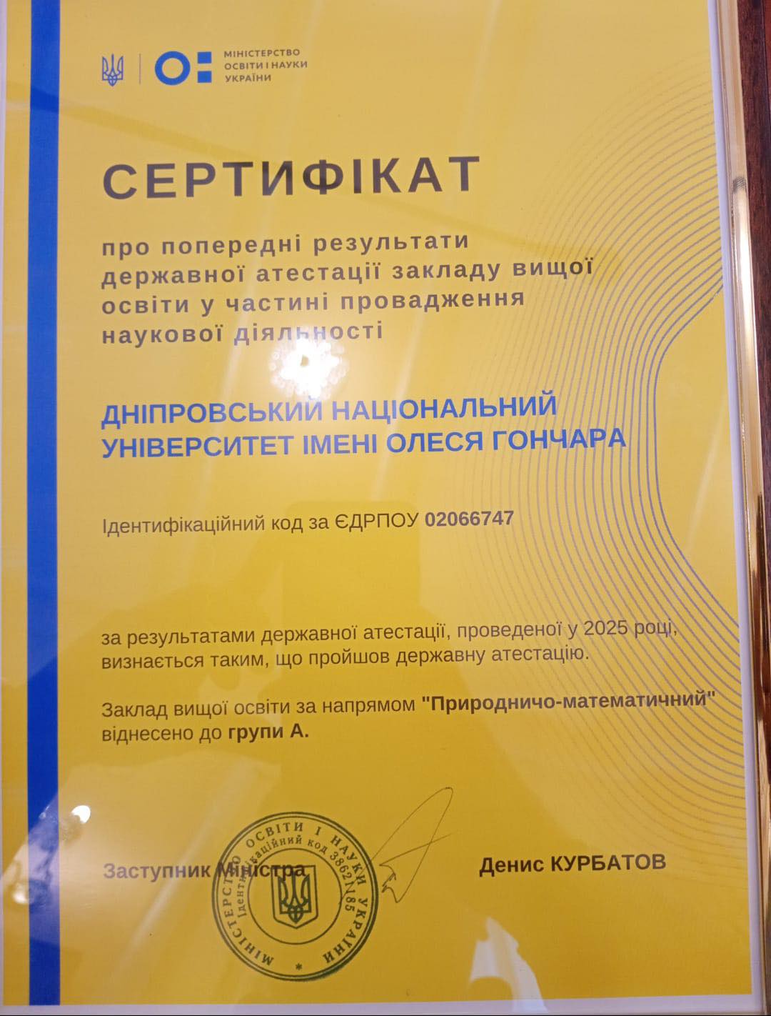 - за науковим напрямом «Природничо-математичний» ДНУ віднесено до Групи «А». Це найвищий результат державної атестації. Загалом, за цим науковим напрямом ДНУ посідає 9 позицію серед усіх ЗВО України;
