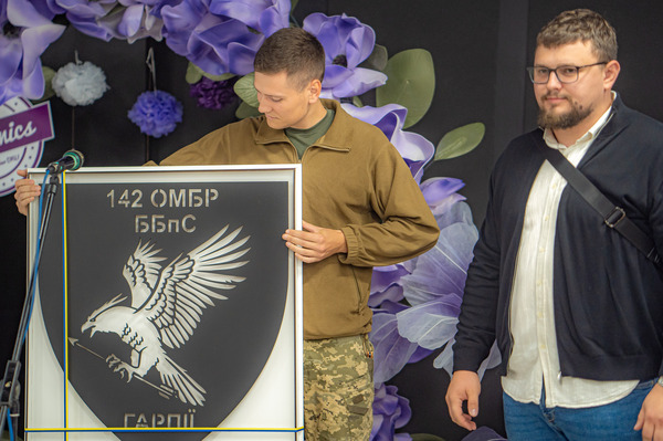 Також для друзів-військових чотирикурсник спеціальності «Менеджмент», засновник компанії Mr. Wood Craft, Артем Кривошея підготував подарунок власного виробництва – шеврон підрозділу 142-ї ОМБр «Гарпії».