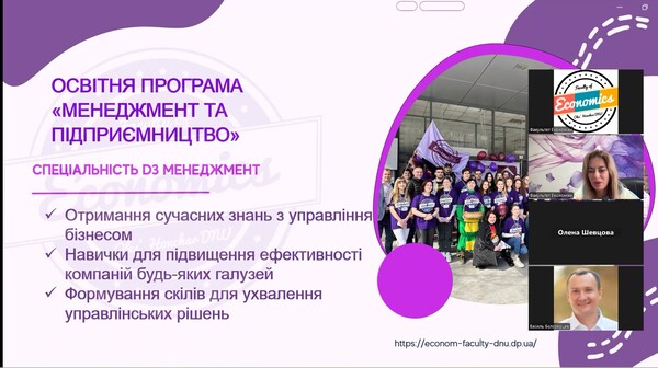 Факультет економіки Дніпровського національного університету імені Олеся Гончара продовжує активну й цілеспрямовану діяльність у напрямі профорієнтаційної роботи. У його межах активно реалізуються заходи, покликані ознайомити учнів і студентів коледжів із особливостями навчання на факультеті, освітніми програмами та перспективами професійного зростання.