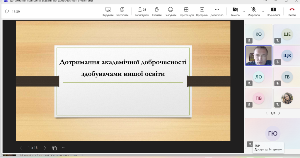 3 листопада заступник декана з наукової роботи кандидат економічних наук, доцент Роман Павлов провів для студентів факультету економіки пізнавальний та змістовний вебінар «Дотримання академічної доброчесності здобувачами вищої освіти»