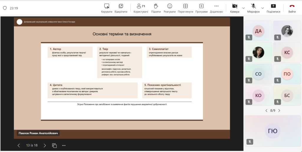 У своєму виступі спікер надав чітке визначення поняттю академічна доброчесність, окресливши її як сукупність етичних принципів і правил, яких повинні дотримуватися всі учасники освітнього процесу під час навчання, викладання та наукової (творчої) діяльності.
