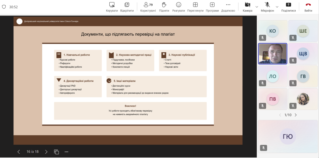 Вебінар проходив у форматі відкритого діалогу: учасники активно ставили запитання, наводили власні приклади та дискутували щодо реальних ситуацій, що можуть виникати під час навчання чи написання наукових робіт. Така атмосфера конструктивного спілкування сприяла усвідомленню того, що доброчесність — це не формальна вимога, а внутрішня культура довіри, поваги та відповідальності.
