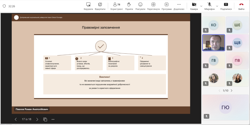 Детально зупинившись на основних видах порушень, Роман Анатолійович пояснив відмінності між такими поняттями, як академічний плагіат, самоплагіат, фабрикація та фальсифікація даних, а також порушення правил цитування та авторського права. Кожен із прикладів супроводжувався практичними коментарями, що допомогло студентам краще зрозуміти можливі ризики та способи їх уникнення у власній роботі.