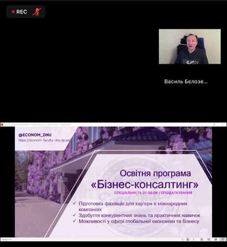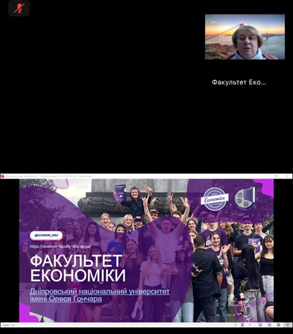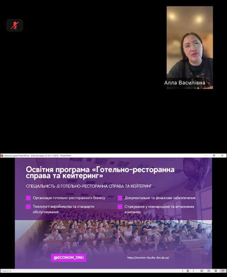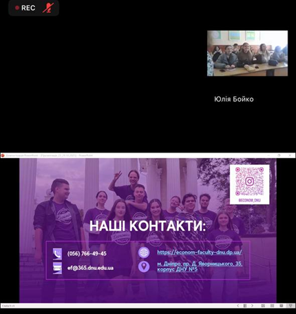 Наступного дня, 6 листопада, відбулася ще одна онлайн-зустріч — із Дніпровським технолого-економічним фаховим коледжем. Учасники заходу мали змогу дізнатися про участь студентів-економістів ДНУ у міжнародних освітніх і наукових програмах, можливості академічної мобільності, стажування за кордоном та подальше працевлаштування у провідних українських і міжнародних компаніях.