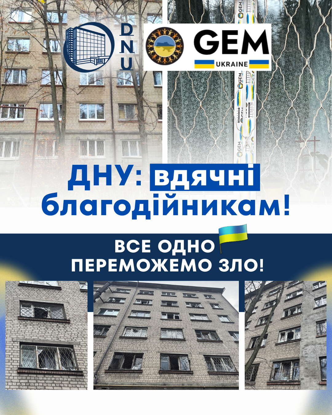 Але в ніч на 18 листопада ворог знову скерував атаку на житлові будинки та цивільні установи поблизу гуртожитків ДНУ. І вікна від GEM усі вистояли! Бо зроблені якісно і з турботою про людей. Але внаслідок масованої атаки постраждали інші кімнати студентів та переселенців із тимчасово окупованих територій.