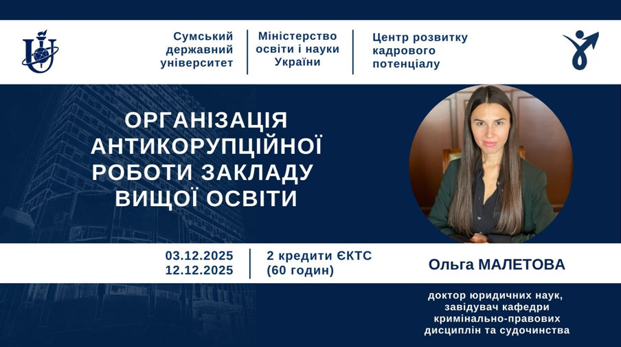 Центр розвитку кадрового потенціалу СумДУ запрошує педагогічних, науково-педагогічних та інших працівників ДНУ до участі у програмі підвищення кваліфікації «Організація антикорупційної роботи закладу вищої освіти»