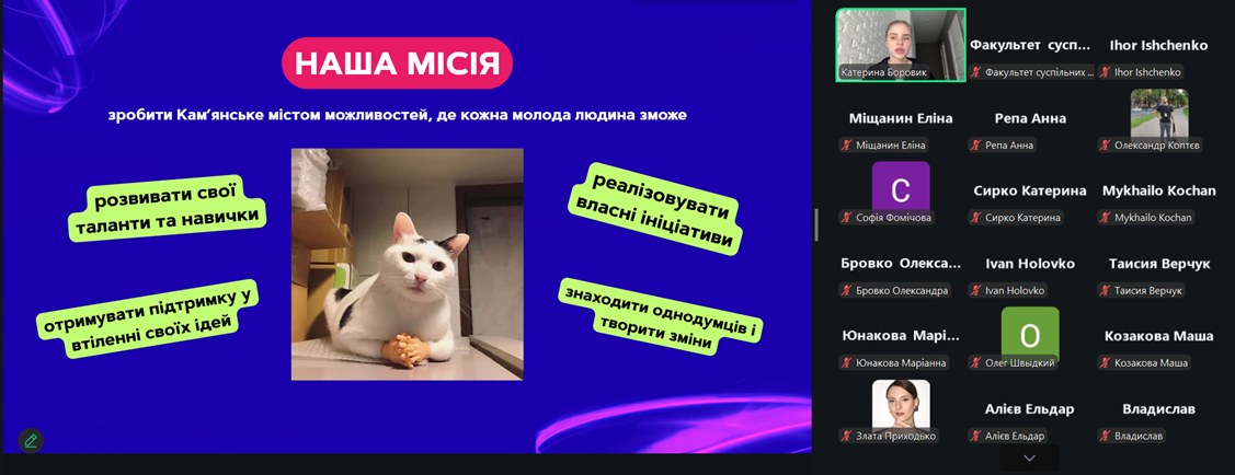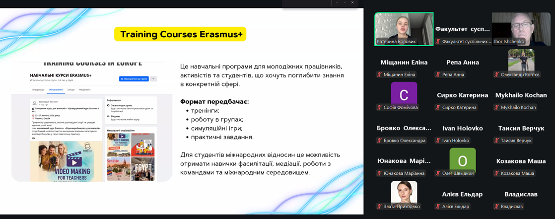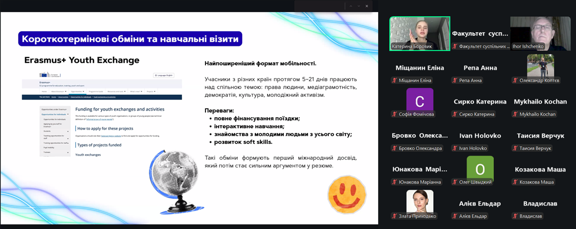 Пані Катерина докладно розповіла про грантові можливості з реалізації студентської активності щодо участі в міжнародних програмах академічного обміну, втілення громадських ініціатив, набуття професійних компетентностей, інтелектуального розвитку, зокрема, розвитку критичного мислення.