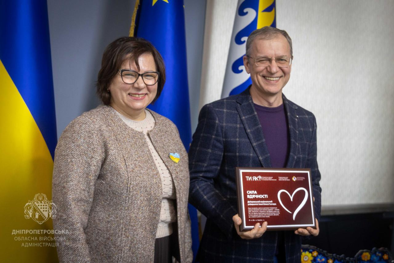 11 грудня ректор Сергій Оковитий від імені колективу Дніпровського національного університету імені Олеся Гончара отримав спеціальну регіональну відзнаку «Сила вдячності» Всеукраїнської програми «Ти як?», ініційованої першою леді Оленою Зеленською. Ця нагорода – заслужена подяка найактивнішим соціальним партнерам – установам, громадам і фахівцям Дніпропетровщини, які щоденно розбудовують систему підтримки ментального здоров’я.