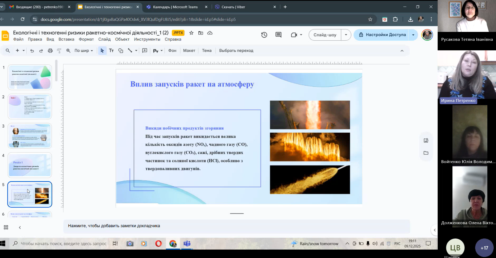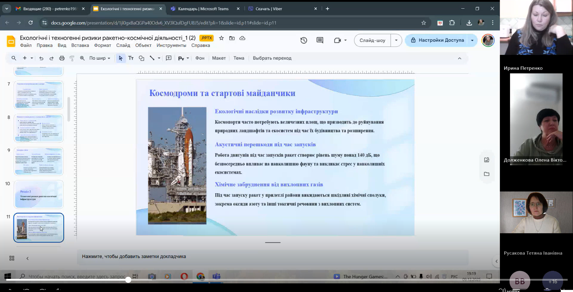 Ірина Павлівна детально розповіла про основні джерела екологічних ризиків ракетно-космічної діяльності. Особлива увага приділялася проблемі космічного сміття, яке сьогодні становить одну з найбільших загроз для орбітальної безпеки та довкілля. Значна частина доповіді також присвячувалася техногенним ризикам, які виникають на космодромах, стартових комплексах, під час виробництва ракет і двигунів, а також у випадках аварій під час запуску.