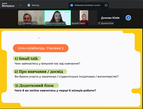 Важливими елементами зустрічі стали розбір студентських CV та тренувальне live-інтерв’ю для п’ятьох активних учасників. За результатами, кожен «претендент на посаду» отримав від пані Олександри конструктивний фідбек.