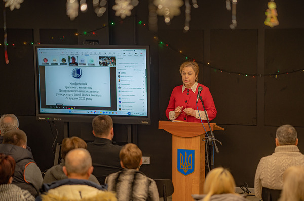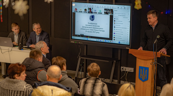 Наприкінці грудня у Дніпровському національному університеті імені Олеся Гончара у змішаному форматі відбулася Конференція трудового колективу, де заслухали й ухвалили звіт ректора, члена-кореспондента НАНУ професора Сергія Оковитого про виконання умов контракту з Міністерством освіти і науки України та цільових показників діяльності університету у 2025 році. Також делегати ухвалили звіт про виконання Колективного договору між роботодавцем та Об’єднаною профспілковою організацією працівників освіти і науки ДНУ на 2022-2026 роки за 2025 рік.