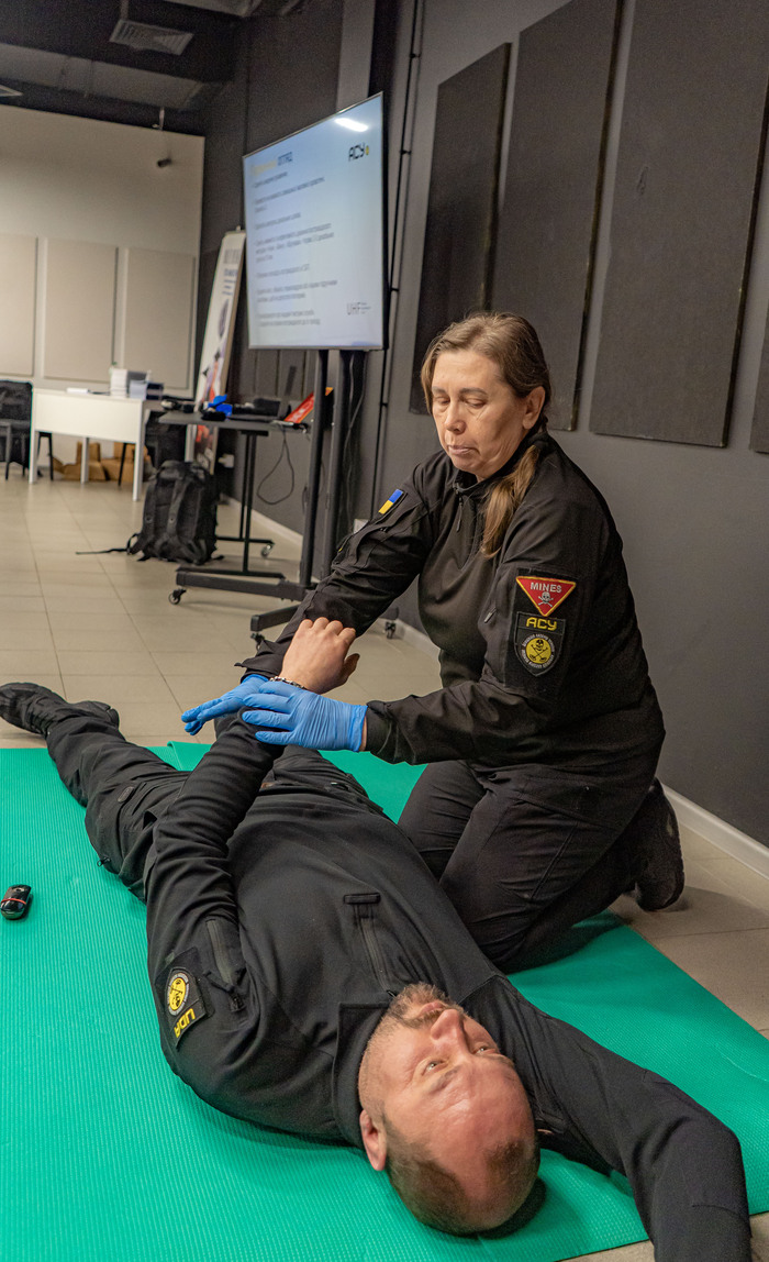 У супроводі експертів з Асоціації саперів України університетські співробітники опановували практичні знання з мінної безпеки. Зокрема, зосередилися на деталях домедичної допомоги при мінно-вибуховій травмі (МВТ) – вивчали комплекс заходів, спрямованих на збереження життя та здоров’я постраждалого до приїзду медичних служб або служб порятунку.