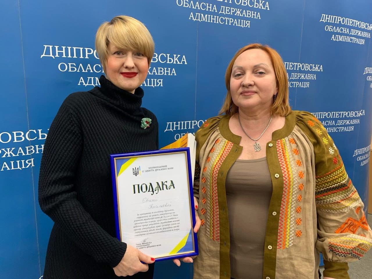 Інспекторка відділу підготовки іноземних студентів Дніпровського національного університету імені Олеся Гончара кандидатка філологічних наук Євгенія Кисільова отримала Подяку від Уповноваженої із захисту державної мови.