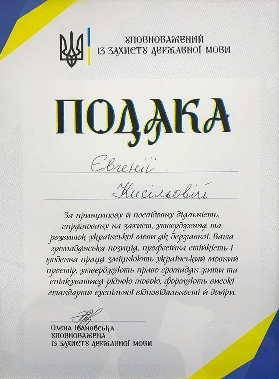 – За принципову й послідовну діяльність, спрямовану на захист, утвердження й розвиток української мови як державної. Ваша громадянська позиція, професійна стійкість і щоденна праця зміцнюють український мовний простір, утверджують право громадян жити та спілкуватися рідною мовою, формують високі стандарти суспільної відповідальності й довіри, – йдеться у тексті офіційної Подяки.