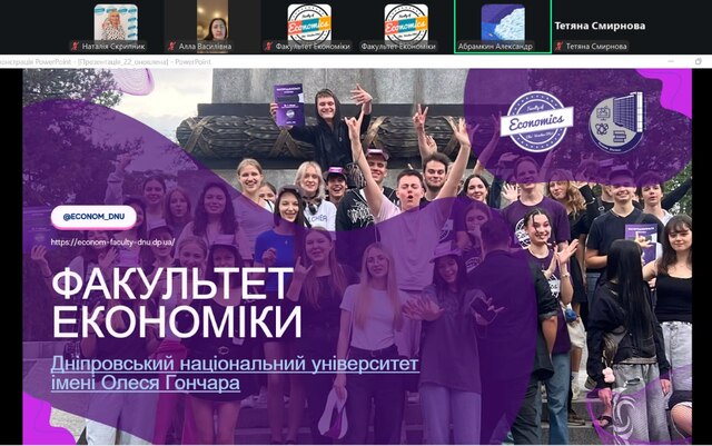 3 березня факультет економіки Дніпровського національного університету імені Олеся Гончара провів онлайн-зустріч із учнями Запорізького академічного ліцею «Перспектива» Запорізької міської ради. Захід відбувся у форматі відеоконференції на платформі Zoom та об’єднав старшокласників і їхніх батьків, які цікавляться економічними спеціальностями та планують своє професійне майбутнє.