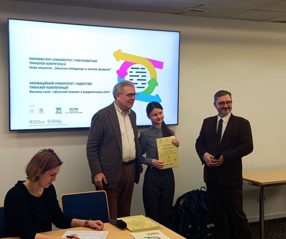 Аспірантка й асистентка кафедри порівняльної філології східних та англомовних країн ДНУ Катерина Русакова взяла участь у роботі Весняної сесії «Штучний інтелект в академічному середовищі» міжнародного проєкту «Інноваційний університет та лідерство – трансфер компетенцій», що проходила у Варшавському університеті. Серед учасників проєкту вона була однією із 25 представників українських ЗВО, які пройшли конкурсний відбір.