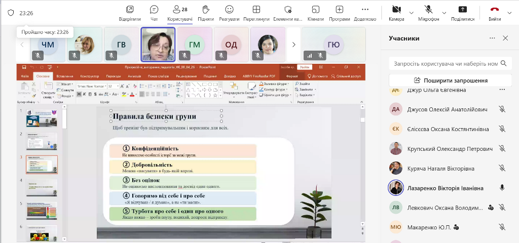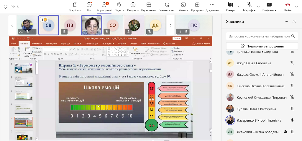 Вікторія Іванівна також розповіла про можливості психологічної підтримки від Психологічної служби університету: індивідуальні консультації, групові тренінги та інші заходи для зміцнення психоемоційного благополуччя викладачів. Онлайн-формат забезпечив інтерактивну участь, обмін досвідом і отримання фахових рекомендацій.