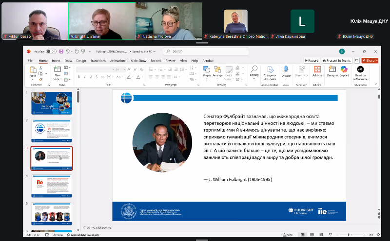 8 квітня у Дніпровському національному університеті імені Олеся Гончара відбувся вебінар із можливостей Програми академічного обміну «Фулбрайт» для навчання, стажування і досліджень у США. Такі пропозиції відкриті для студентів, науковців, викладачів і співробітників – фахівців у різних галузях.