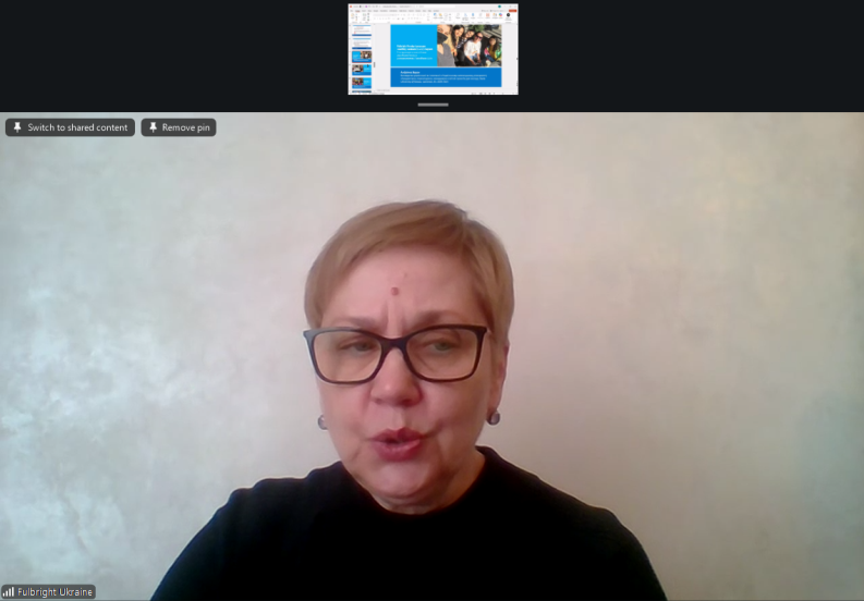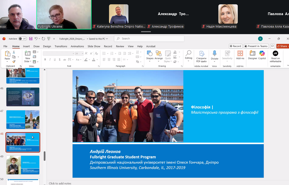 Представники ДНУ неодноразово ставали фулбрайтівськими стипендіатами. До вебінару долучилася стипендіатка Програми Наталія Фролова, доцентка кафедри педагогічної та вікової психології нашого університету. Вона розповіла про власний успішний досвід участі стажування у США. Наталія Фролова стала єдиним психологом з України, який виборов стипендію Фонду Фулбрайта у 2023-2024 навчальному році. Протягом дев’яти місяців вона проводила важливі для українців наукові дослідження в Університеті Каліфорнії у місті Ірвайн, працюючи під керівництвом академіка та почесної професорки університету, одного з кращих кризових психологів у світі Роксани Коен Сільвер. Також незабаром завершує 8-місячне стажування за Програмою Фулбрайта директор Науково-дослідного інституту хімії та геології ДНУ, професор Віталій Пальчиков. В Університеті Карнегі-Меллона разом з іншими дослідниками він бере участь у розробці фотоперимикачів на основі норборнадієнових структур, які можуть бути використані як ключові компоненти в молекулярних сонячних термальних системах.