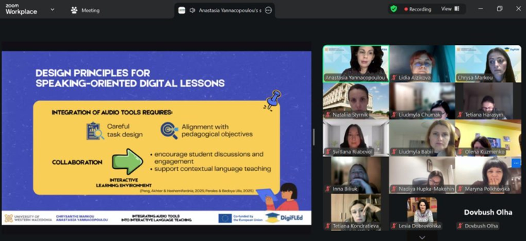 Цього року проєкт DigiFLEd розширив серію вебінарів, активно залучивши до їх проведення європейські університети-партнери. Це створило нові можливості для обміну досвідом, поглядами та викладацькими практиками між представниками різних країн і освітніх контекстів. Одним із таких внесків став вебінар, організований колегами з Університету Західної Македонії, присвячений цифровому викладанню мов і розвитку навичок говоріння.