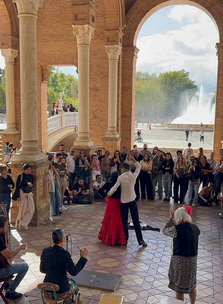 У травні Андалусія святкує феєрію: це унікальна пора, коли всі на вулицях одягнені в традиційні костюми фламенко, проводяться ярмарки й безліч атракціонів, а ввечері – танці й музика. Усе це дійство триває цілий тиждень! Було надзвичайно цікаво одягнутися в стилі фламенко, покласти квіти у волосся й святкувати з усіма.